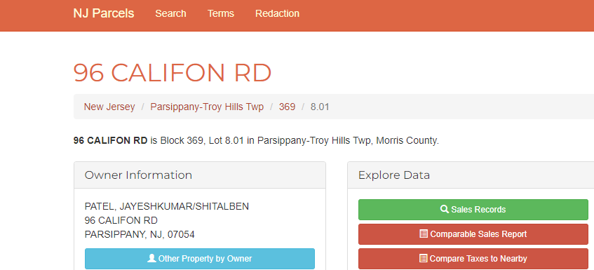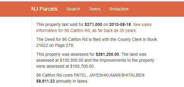 Jayeshkumar Patel bought 96 Califon Rd on 08/10/2010 who’s still the current owner.