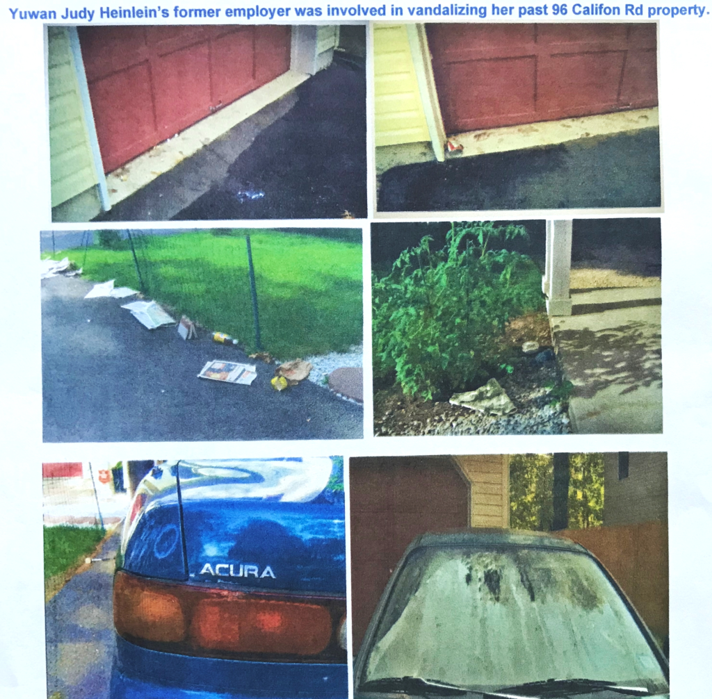 (She was provoked and sexually harassed by her former employer). After Yuwan Judy Heinlein refused her former employer’s sexual advances who was involved in making several hangup phone calls from October 2001 to August 2002 to her daily and even after she changed her phone number! After she disconnected her phone service in September 2002, a identifiable woman came over to her past property to check if she still lived there. Her former employer was involved in vandalizing her past property.